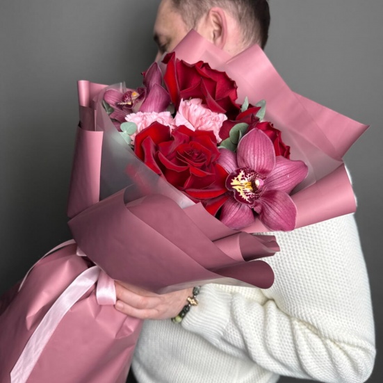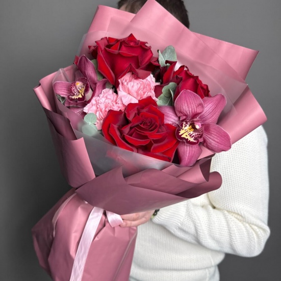 Букет из 3 красных роз, орхидей и диантуса в Электростали
