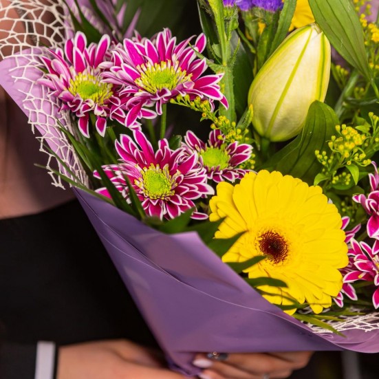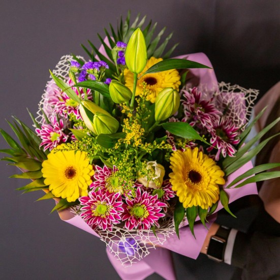 Букет с розами, хризантемами, лилиями, герберами в Электростали
